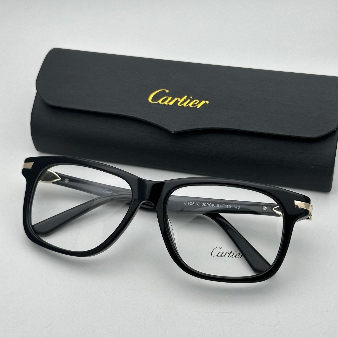 Monture noire rectangulaire avec accents métalliques. Élégance Cartier et confort haut de gamme. Étui rigide inclus.